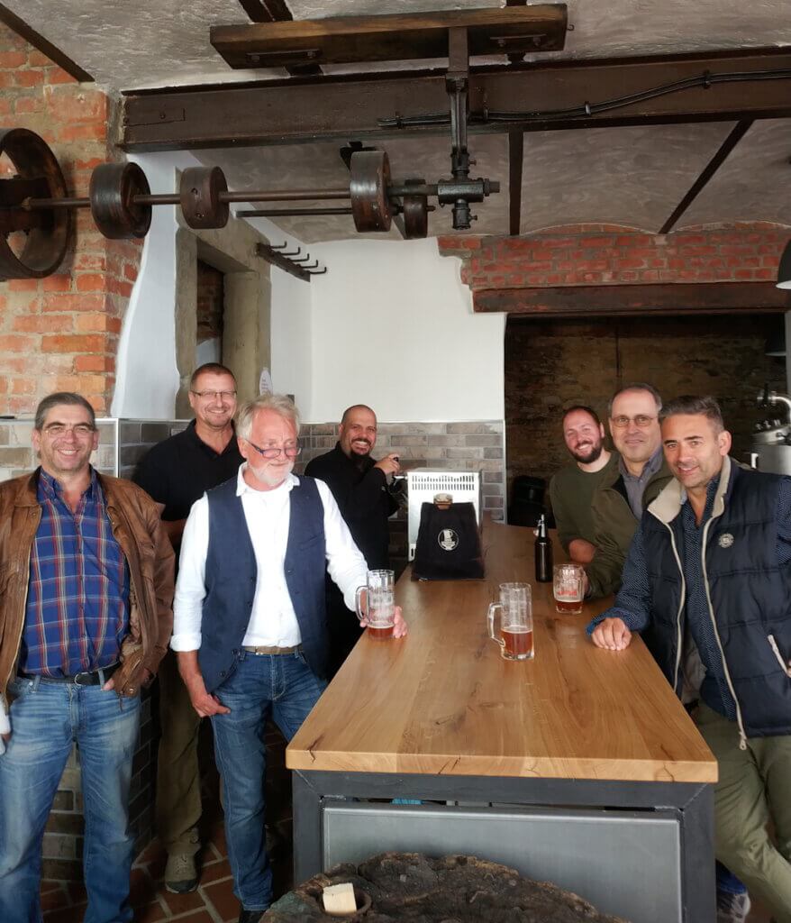 Mit im Team ist zum einen mit Norbert Ebner, ein langjähriger Freund von Peter Winkler, der mit dem Arzt nicht zuletzt das beliebte Kellermühlenfest seit vielen Jahren organisiert. Unter seiner Federführung wurden von den angehenden Brauern in den vergangenen Monaten viele Stunden Arbeit Eigenleistung in der ehemaligen Schmiede zugebracht, gepflastert, umgebaut und die Räumlichkeiten mithilfe einiger Mitstreiter auf Vordermann gebracht. Darunter Frank Schadt, Ingenieur und Hobby-Brauer, Landwirt und Zweiter Bürgermeister Armin Grötsch, mit Erik Großmann ein Mitarbeiter der Wiesenbronner Behälterbaufirma Roth, mit Thomas Bergner ein Ausbilder der Schlosserei der Firma GEA Brausysteme in Kitzingen und mit Michael Gebert schließlich ein „echter“, gelernter Braumeister. Die Mainbernheimer haben für ihr Projekt zum 1. März 2018 eine GbR gegründet.